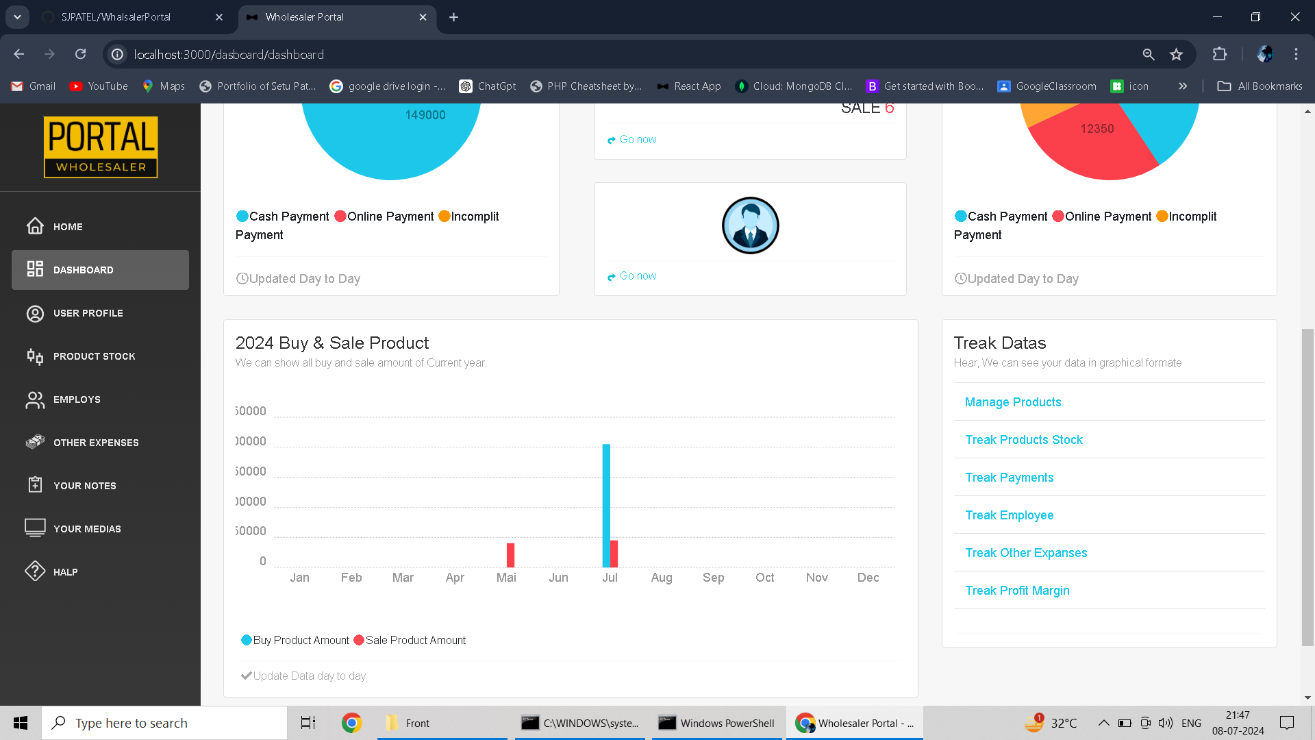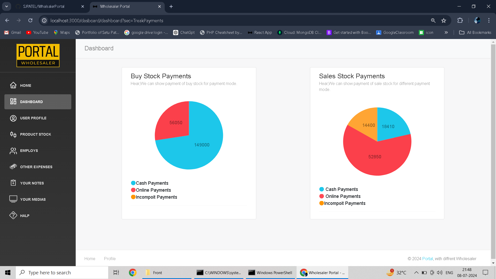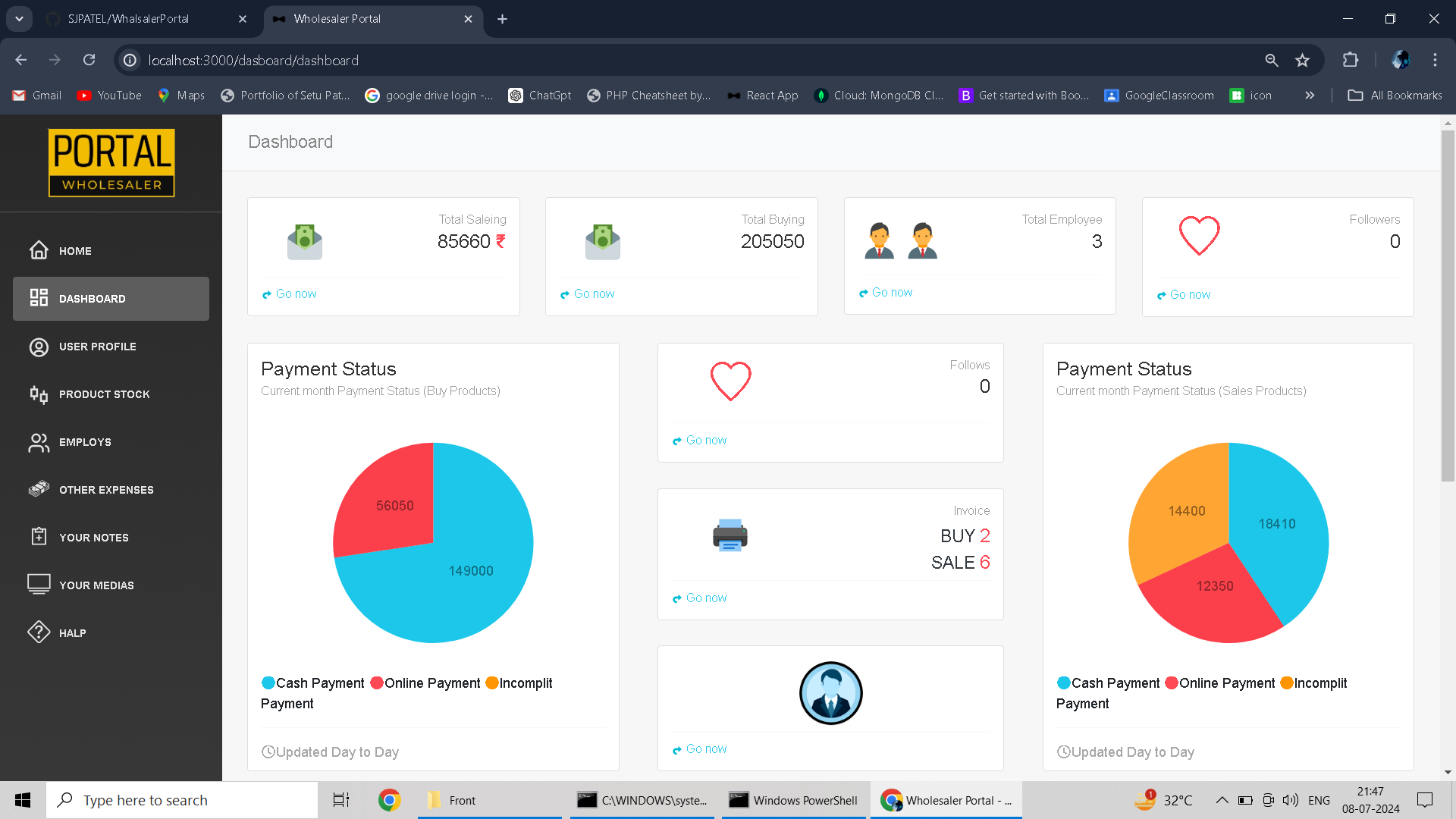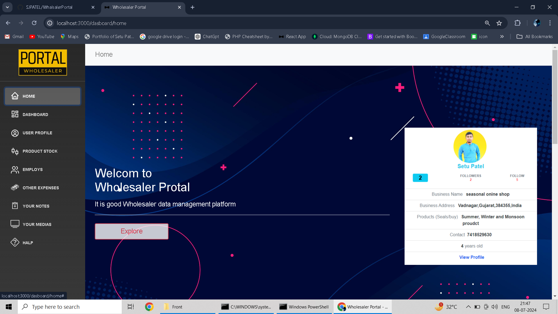 I provide full-stack development in web development, utilizing a stack that includes HTML, CSS, Bootstrap 5, JavaScript, PHP, and MySQL, as well as MongoDB, ReactJS, Express, and Node.js